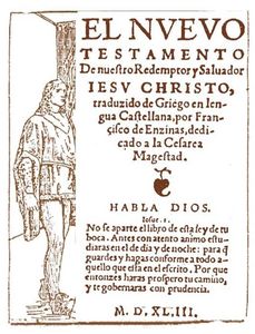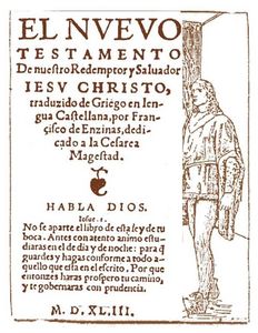 El primero en traducir todo el Nuevo Testamento al español fue Francisco de Enzinas, quien nació alrededor de 1518 en Burgos, España. En 1539 imatriculó en la Universidad de Lovaina, donde estudió durante dos años. Más tarde, en 1541, se mudó a la Universidad de Wittenburg, donde estudió griego. Y, aquí es donde comenzó su traducción de la Biblia en español del texto griego al español. Dos años después, terminó y todo su Nuevo Testamento fue impreso en 1543 en Amberes, por Esteban Mierdman. Después fue entrevistado por el emperador Carlos V, y luego arrestado por el confesor del emperador y encarcelado por su "terrible crimén" de haber traducido la Biblia al español. En 1545, Enzinas logró escapar de la prisión y se dirigió a Wittenburg, donde escribió un libro sobre su persecución y aventuras.